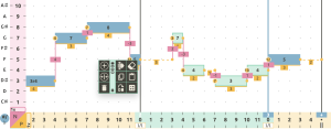 En el plano, el eje horizontal representa los pulsos definidos en cada segmento y el eje vertical la colección de notas. El espacio definido por cada segmento está delimitado entre 2 barras verticales negras.