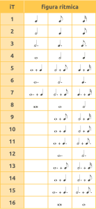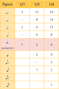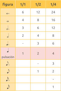 Son las distancias entre los Pulsos escogidos y corresponden a las distintas figuras musicales. Para hacer las equivalencias, todo dependerá de la figura que asignemos al número 1. Veamos algunos ejemplos: