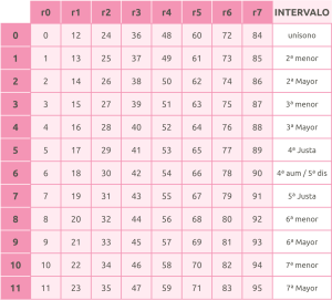 En los intervalos, la relación entre la numeración modular (iSm o iAm) y la numeración absoluta (iSa o iAa) se expresa a continuación: