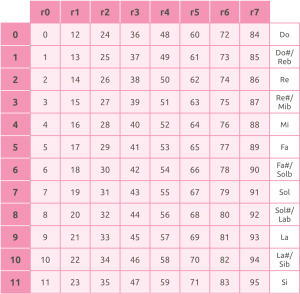 El módulo 12 aplicado a las Notas, genera los distintos registros de un piano (y de cualquier instrumento). Aparece entonces la numeración modular (Nm):