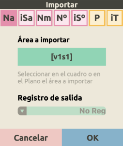 Deberás seleccionar primero en la fila superior el elemento a importar. En el área a importar la app te recuerda de qué voz (v) y/o qué segmento (s) provienen los elementos importados. Dependiendo del elemento a importar, aparecen al final de la tabla distintas opciones para ajustar.