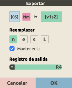 Por último, para exportar una fila de elementos de la calculadora a tu composición, primero selecciona la fila deseada. Comprueba que la fila en cuestión tiene asignado el elemento al que quieres exportar la secuencia (puedes verlo en la propia fila). Después selecciona un segmento de una voz o toda la voz, y clica el botón de exportar