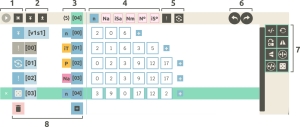 Además, en cada fila y de izquierda a derecha, observamos: el símbolo de la operación realizada, a qué fila se le realizó la operación, el elemento asignado a la fila, el número de la operación, las casillas con los números de los elementos, y el símbolo + para añadir una nueva casilla: