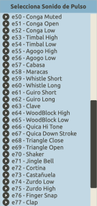 Si quieres que todos los sonidos de una voz suenen siempre con el mismo sonido de percusión, puedes hacerlo también de la siguiente manera: asigna al elemento indefinido «e» un sonido de percusión, pinchando en el panel de la voz la letra «e» que aparece abajo a la derecha. De esta manera si introduces elementos indefinidos «e» en la línea de las Notas, tendrán siempre el sonido que les asignaste. Los sonidos disponibles para el elemento indefinido son los siguientes: