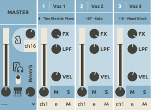 En las columnas de cada voz puedes ajustar el volumen de la voz en la barra vertical, ajustar la panorámica del sonido de la voz en el circulito debajo de la barra del volumen, seleccionar el sonido para esa voz, modificar la cantidad de reverberación para esa voz (FX), añadir un filtro para suavizar la voz (LPF), cambiar la velocidad MIDI (VEL), silenciar la voz (M), escucharla a solo (S), elegir el canal de salida, ajustar el sonido para el elemento indefinido de esa voz (e), y seleccionar el tipo de metrónomo para la voz en la M tachada.