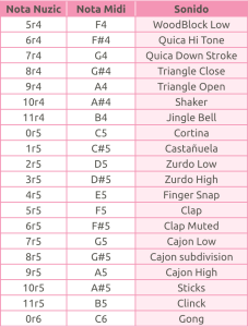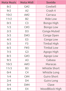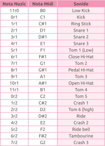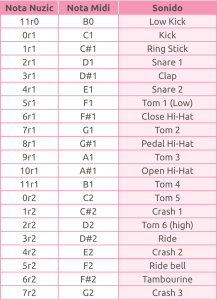 El instrumento 128 corresponde a la percusión o batería MIDI. Si lo seleccionas, cada Nota de la partitura tendrá un sonido diferente. La relación de sonidos del 128.0, «standard drum», es la siguiente: