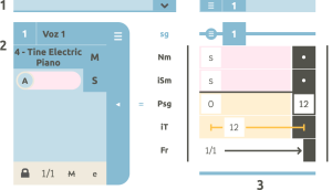 - Pestaña desplegable (solo en el modo de visualización del cuadro): abre una ventana donde se escogen los elementos sonoros a visualizar, y su numeración. El botón de su izquierda cambia de una sola vez la numeración de todos los elementos (modular o escalar).